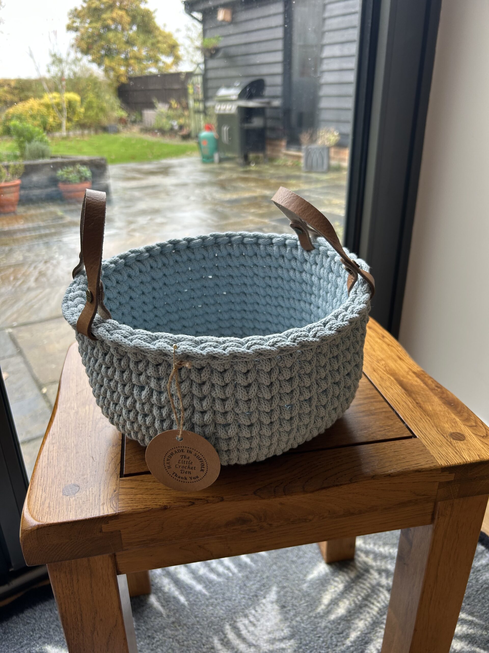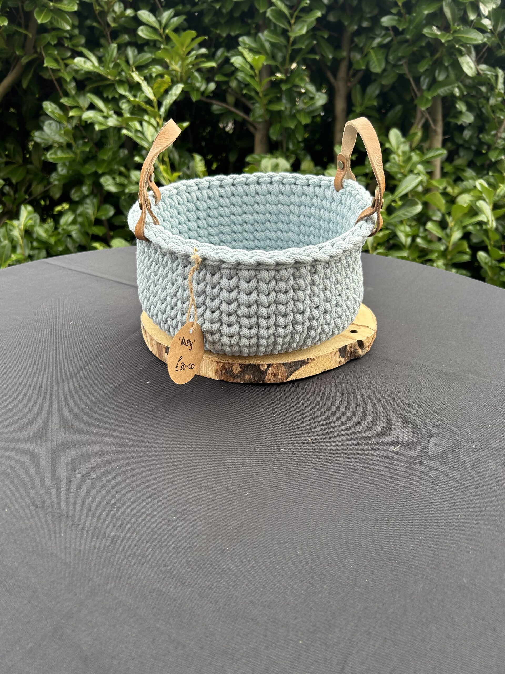 Made with sturdy macrame yarn and finished with leather handles.