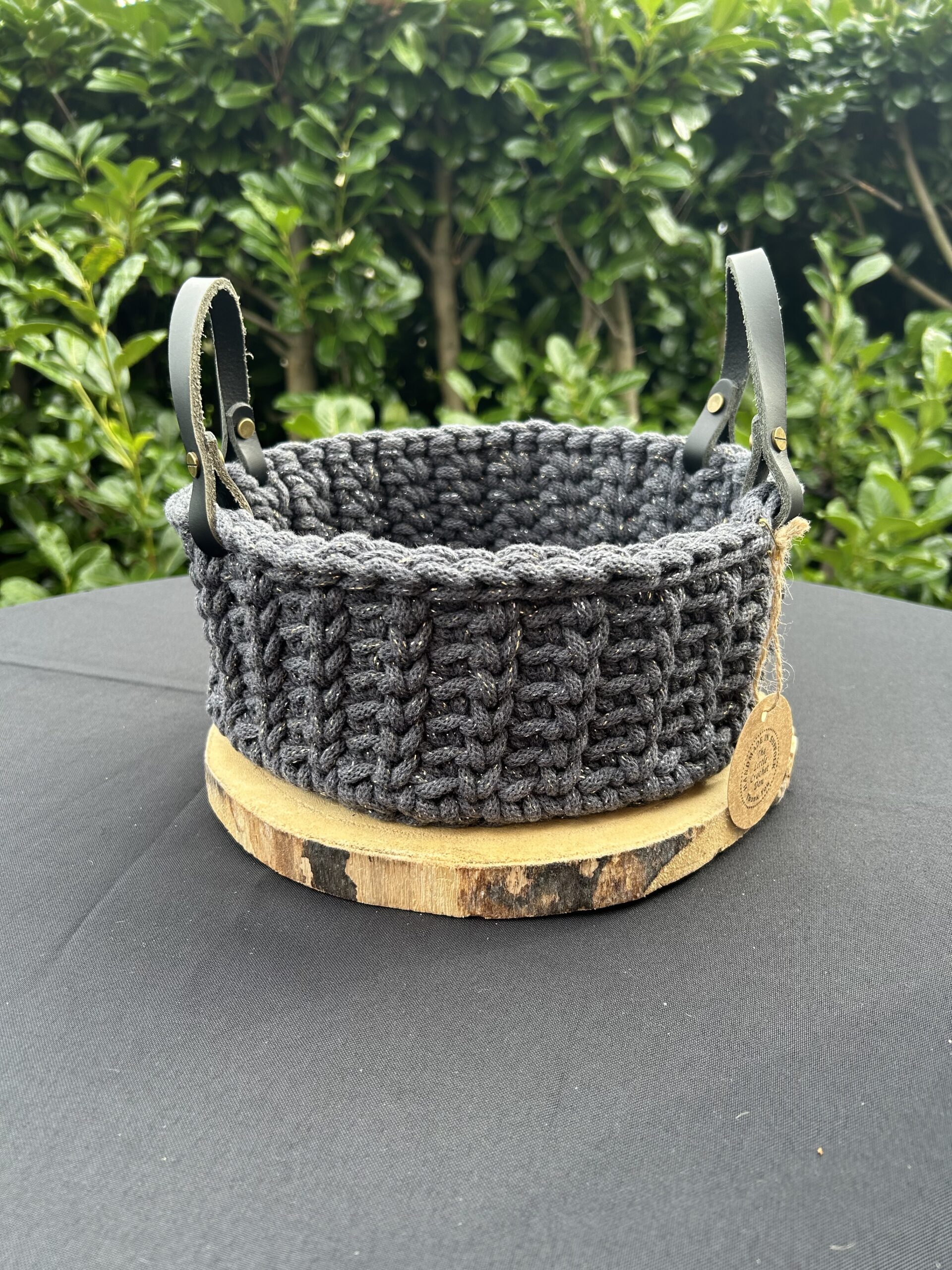 Attractive ribbed stitch crochet basket. Made with sturdy macrame cord and finished with black leather handles. This cord has a metallic fleck running through it.