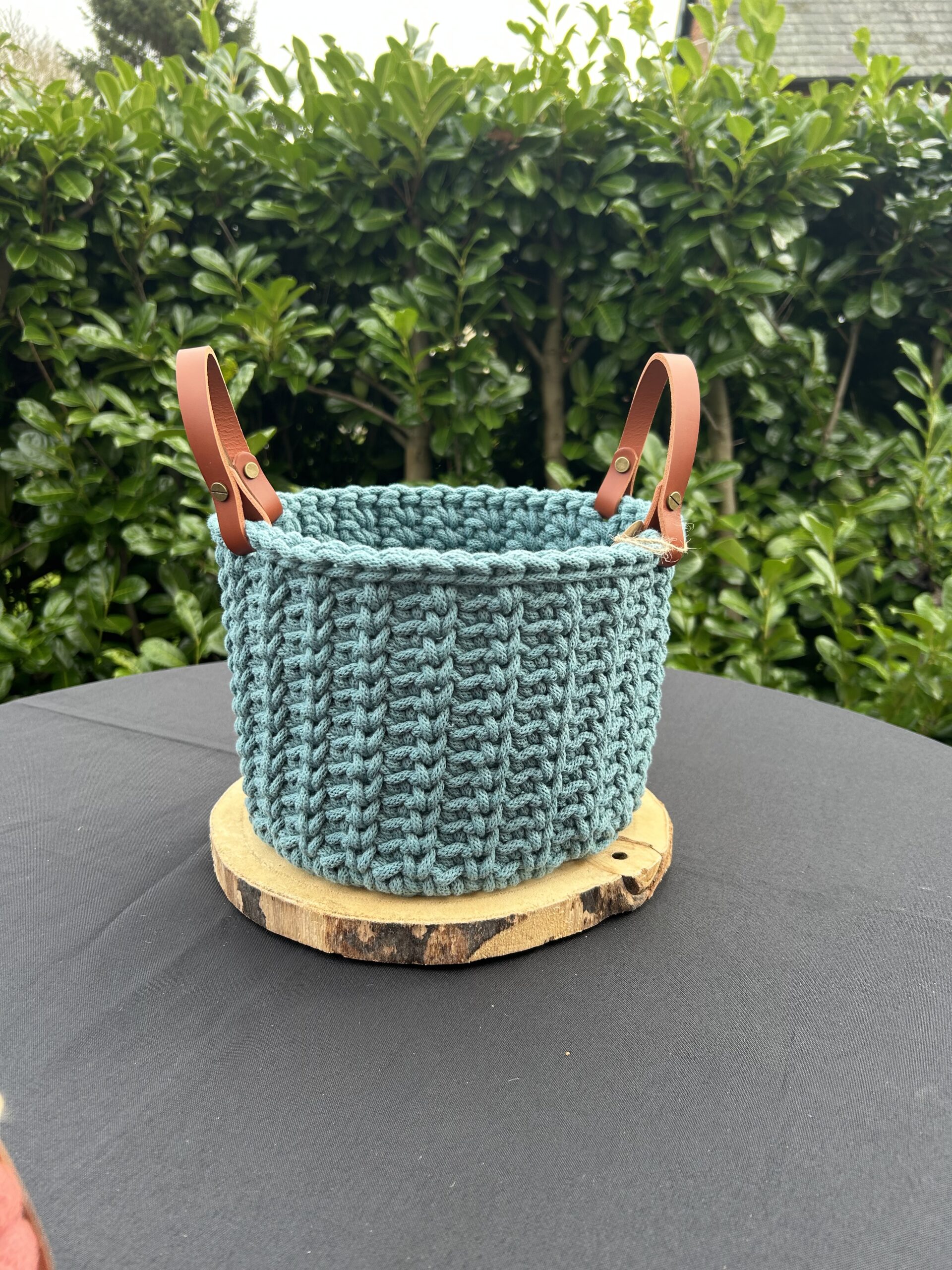 Sturdy, quality rib stitch basket. Perfect for your storage needs. Finished with leather handles.