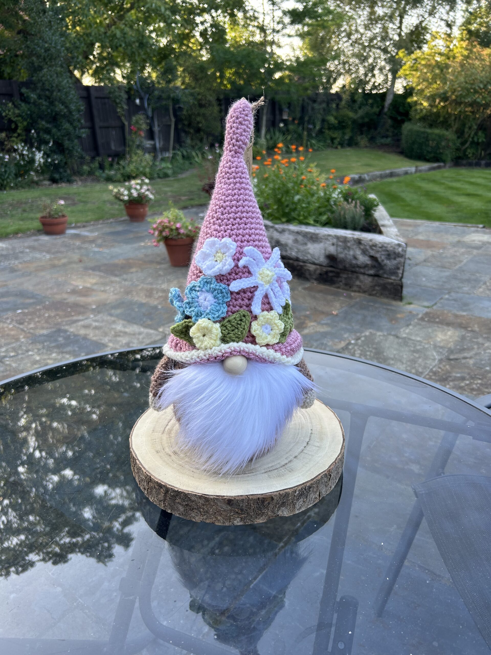 Attractive gnome with flower details on the hat. Finished with a wooden nose and faux fur beard.