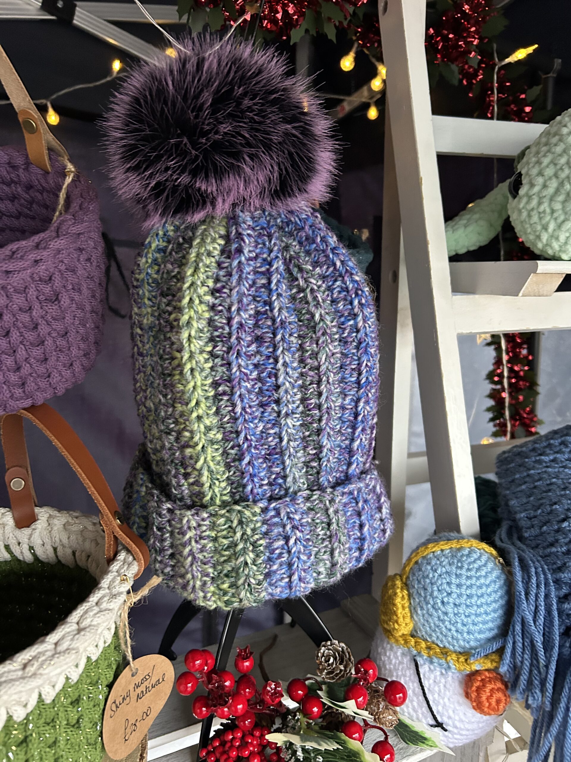 Attractive hat in green, blue and purple tones. Finished with a quality purple pom pom.