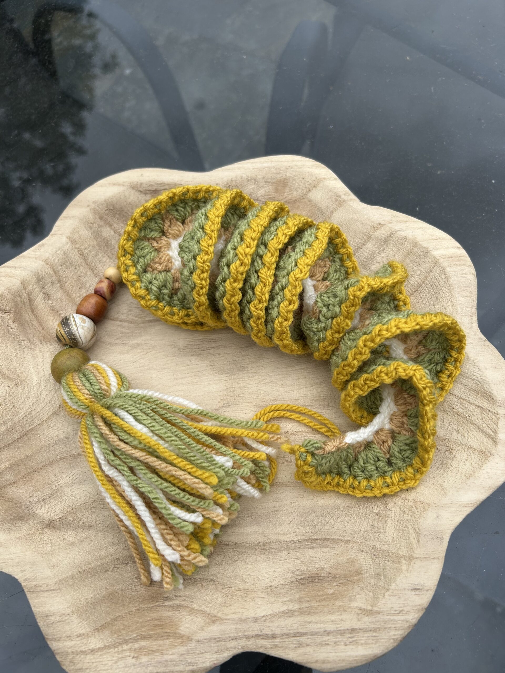 Attractive wind spinner in mustard, green, neutral and cream tones. Finished with coordinating wooden beads. Perfect for hanging in the garden, a gazebo or open window.