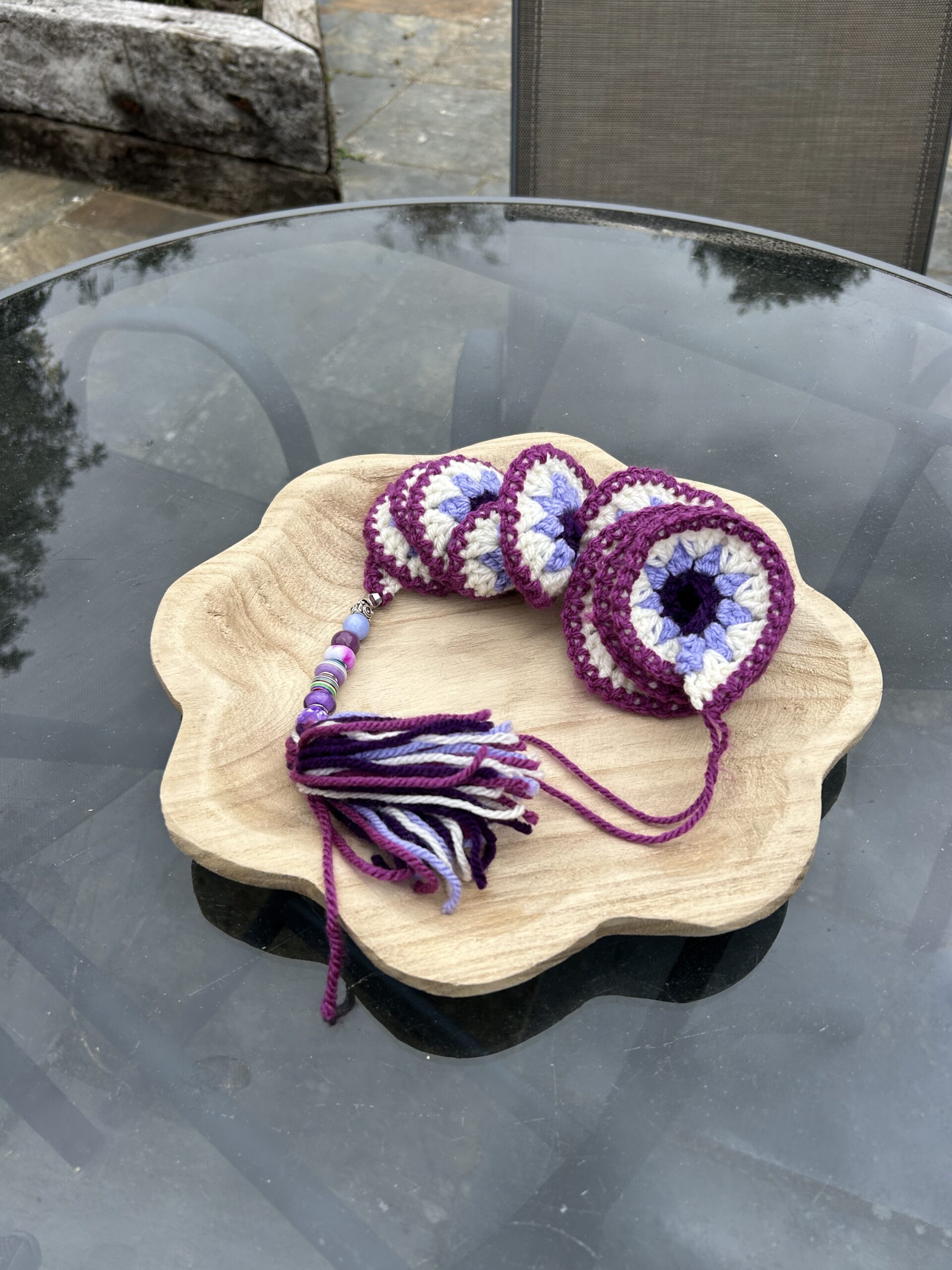Attractive wind spinner in purple, plum and mustard tones. Finished with coordinating wooden beads. Perfect for hanging in the garden, a gazebo or open window.