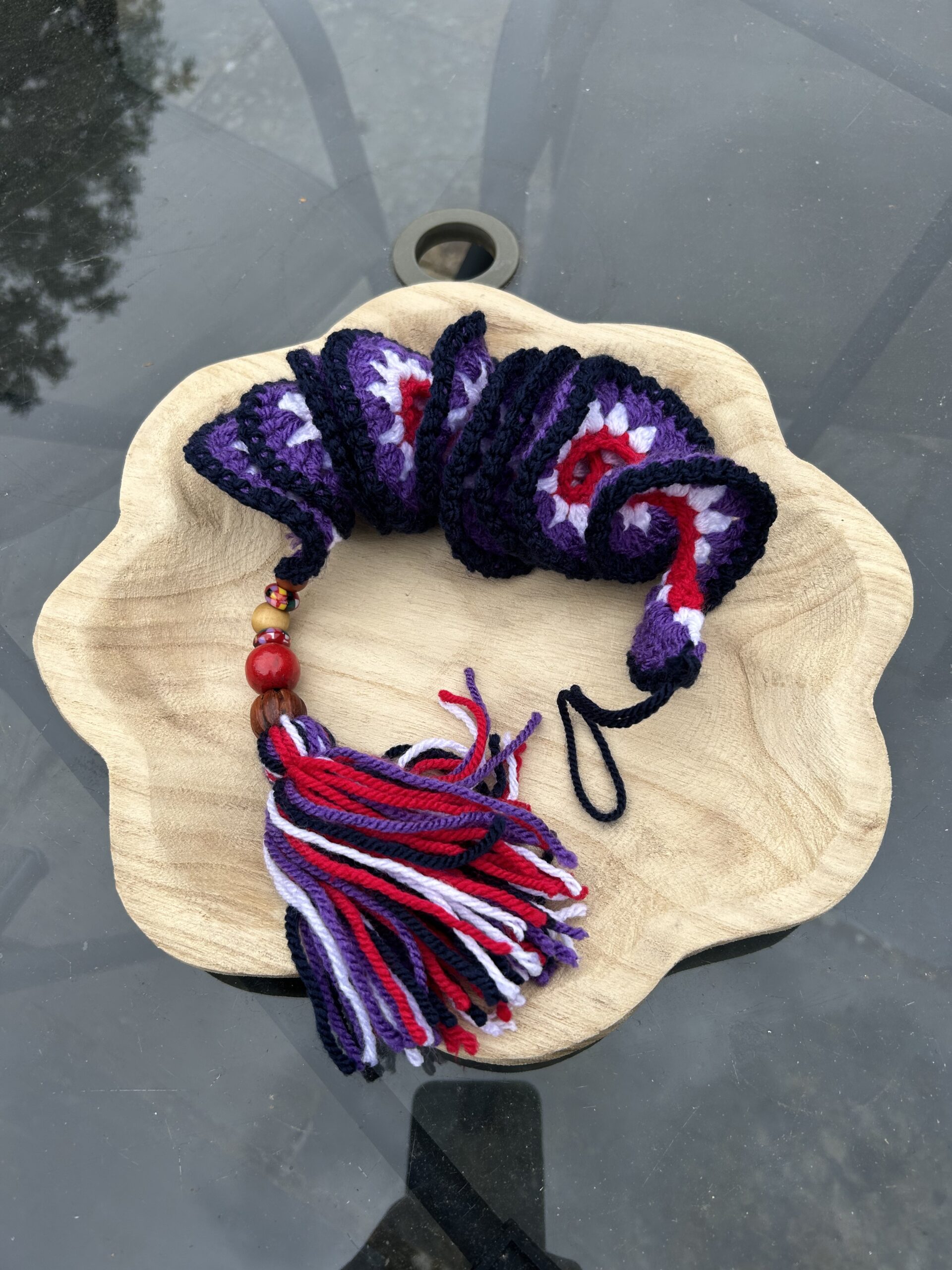 Attractive wind spinner in purple, red and cream tones. Finished with coordinating beads. Perfect for hanging in the garden, a gazebo or open window.